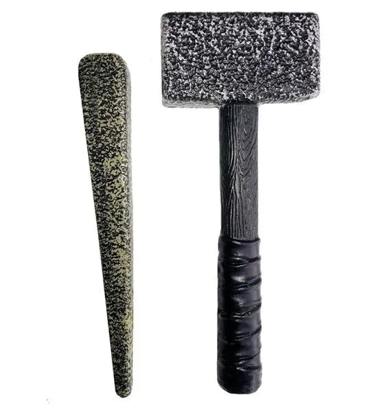 Młotek w kolorach srebra i czerni, natomiast kołek w kolorach beżu i czerni.