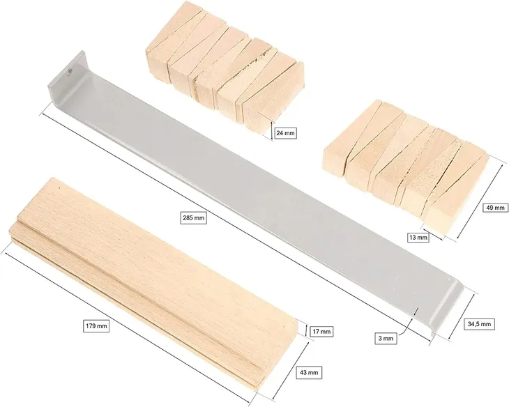Zestaw montażowy służy do montowania i układania paneli podłogowych i desek. W zestawie znajduje się 30 klinów drewnianych, metalowa łyżka oraz drewniany dobijak, który jest wykorzystywany jako dźwignia pomocna przy dociskaniu paneli przy samej ścianie.