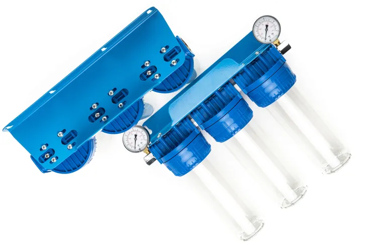 - 3x skręcone, gotowe do instalacji 10-calowe filtry narurowe na metalowej płytce montażowej