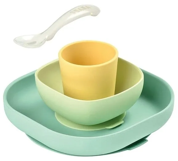 Komplet naczyń z silikonu francuskiej marki BEABA składa się z talerzyka, miseczki, kubka i łyżeczki treningowej. Wszystkie elementy zestawu charakteryzuje ergonomiczny, zaokrąglony kształt i miękkie, gładkie brzegi. Wyższe boki miseczki i talerzyka ułatwiają dziecku samodzielne nabieranie posiłku na widelec czy łyżkę. Naczynia te mają na spodzie antypoślizgową przyssawkę, dzięki czemu są stabilne i dobrze trzymają się stołu. Kubeczek jest poręczny i wygodny do nauki picia, a łyżeczka idealnie dopasowuje się do dziecięcej buzi i można ją odłożyć tak, by główka nie dotykała powierzchni, dzięki czemu jej używanie jest o wiele bardziej higieniczne.