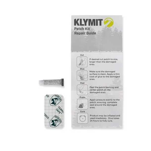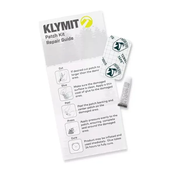 KLYMIT Patch Kit to zestaw naprawczy do wszystkich mat oraz siedzisk. W skład zestawu wchodzą 2 samoprzylepne łatki o wymiarach 6.4cm x 3.8cm oraz tubka kleju do standardowych łatek materiałowych.