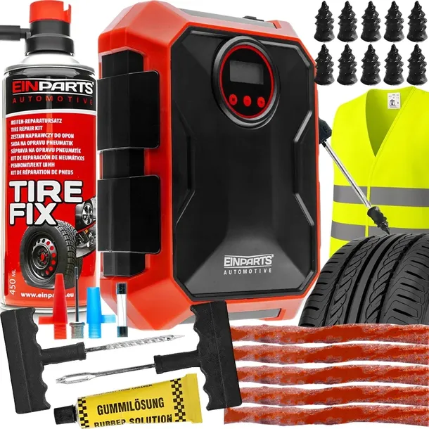 🚗💨 ZESTAW Kompresor samochodowy 12V EINPARTS EPAP04 – 150 PSI / 10 Bar z elektronicznym manometrem LCD + WIERŁO, SZYDŁO, SZNURKI, KLEJ + 10x wkręty wulkanizacyjne + Uszczelniacz 450ML + Kamizelka odblaskowa