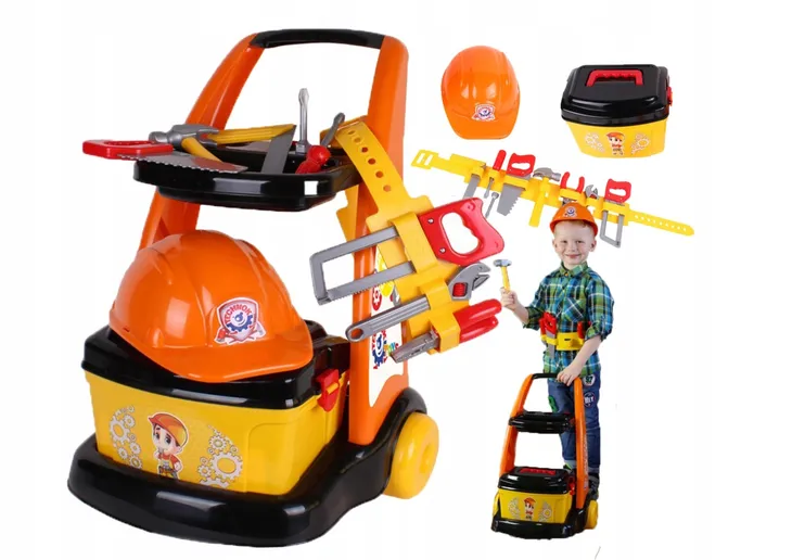 W zestawie m. in.: wózek na narzędzia, kask, pas, piła do metalu i piła do drewna, młotek, klucz, śrubokręt.