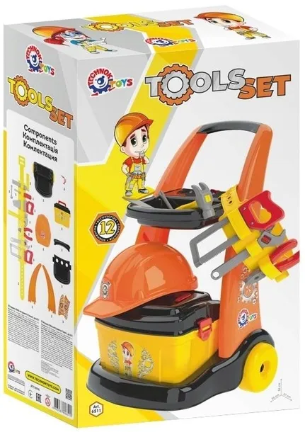 Zabawka "Zestaw narzędzi ". Opakowanie - jasne pudełkoW zestawie m.in.: wózek na narzędzia, kask, pas, piła do metalu i piła do drewna, młotek, klucz, śrubokręt.