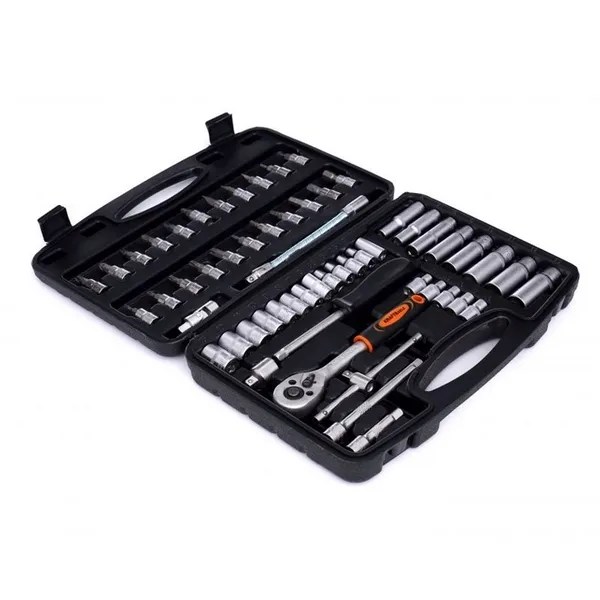 Cały zestaw składa się z 56 różnych elementów, które zapewnią odpowiedni dobór narzędzia do potrzeb. Narzędzia wykonane są z utwardzanej stali chromowo-wanadowej (CrV) przeznaczonej dla narzędzi warsztatowych. Chrom gwarantuje odporność stali na korozję, utlenianie, ścieranie i dużą wytrzymałość na wysokie temperatury. Dodatek wanadu hamuje wzrost ziaren podczas obróbki, zwiększając jednocześnie ciągliwość zarówno postaci hartowanej, jak i odpuszczonej.
