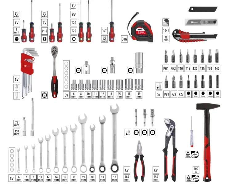 80-częściowa walizka narzędziowa Einhell jest idealna do codziennych prac w warsztacie i w domu. Niezależnie od tego, czy chodzi o mocowanie szafek, regulację drzwi, naprawę zabawek i rowerów, czy też prace konserwacyjne przy samochodach i motocyklach. Skrzynka narzędziowa jest kompatybilna z systemem Einhell E-Case i posiada system blokowania do łączenia skrzynek narzędziowych w stosy. Składane zawiasy zapewniają łatwe otwieranie i zamykanie skrzynki narzędziowej, nawet gdy jest ona ustawiona jedna na drugiej. E-CASE można również zabezpieczyć przed kradzieżą za pomocą standardowej kłódki. Dwa chowane, ergonomicznie ukształtowane uchwyty zapewniają wygodę przenoszenia. Szeroka gama narzędzi zapewnia kompleksowy zestaw podstawowego wyposażenia. Zawartość walizki narzędziowej obejmuje młotek ślusarski o wadze 300 g z certyfikatem TÜV, szczypce kombinowane o długości 160 mm do chwytania i gięcia, szczypce do pomp wodnych o długości 250 mm do rur i prac montażowych, sześć różnych wkrętaków PH2 x 100 / SL5,5 x 100 / T20 x 100 / T25 x 100 mm / PH2 x 38 mm / SL5,5 x 38 mm oraz tester fazy z certyfikatem TÜV do napięć w zakresie 200-250 V. Podczas gdy zestaw kluczy nasadowych sześciokątnych w rozmiarach 1,5 / 2 / 2,5 / 3 / 4 / 5 / 6 / 8 / 10 mm jest idealny do śrub z gniazdem sześciokątnym, 18 bitów w rozmiarze 25 mm zapewnia obsługę wszystkich popularnych profili śrub, takich jak Phillips, Pozidriv, Torx i Hex. Zestaw walizek narzędziowych zawiera również dziewięć kluczy nasadowych o szerokości 6 / 8 / 10 / 11 / 12 / 13 / 15 / 17 / 19 mm do śrub sześciokątnych i nakrętek, nóż z odłamywanym ostrzem z dziesięcioma zapasowymi ostrzami w rozmiarze 18 mm, dziewięć kluczy płasko-oczkowych w rozmiarach 6 / 7 / 8 / 11 / 12 / 14 / 15 / 16 / 19 mm oraz trzy klucze z grzechotką oczkową w rozmiarach 10 / 13 / 17 mm do ciasnych połączeń. Wybór uzupełnia grzechotka dwustronna z obrotami w prawo i w lewo, napędem 3/8”, 72 zębami i przyciskiem zwalniającym dla nasadek. Zestaw Einhell zawiera również taśmę mierniczą o długości 3 m do precyzyjnych pomiarów oraz nasadkę do świec zapłonowych o średnicy 16 mm do prac konserwacyjnych w samochodach. Adapter trójdrożny, trzy adaptery kluczy nasadowych i element przesuwny do przedłużania z otworem 13 mm rozszerzają zakres zastosowań zestawu narzędzi, umożliwiając łączenie go z innymi narzędziami. Narzędzia w walizce systemowej są bezpiecznie przechowywane w dwukolorowej wkładce z pianki EVA® o wyglądzie karbonu. Dwie wkładki zapewniają wystarczającą ilość miejsca na wszystkie narzędzia, umożliwiają transport bez zarysowań i utrzymują porządek wewnątrz walizki. Wkładki można łatwo wyjąć i wymienić dzięki wgłębieniom po bokach. Oznacza to, że zestaw narzędzi można elastycznie przechowywać na stole warsztatowym lub w miejscu pracy, a potrzebne narzędzia są szybko pod ręką. 80-częściowa walizka narzędziowa wykonana z wysokiej jakości polipropylenu jest odporna na wysokie temperatury, zachlapania, uderzenia, a dzięki swojej wytrzymałości idealnie nadaje się do użytku mobilnego.