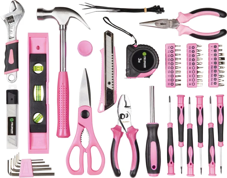❇️ Stylowa różowa torba FIELDMANN zawiera 71-częściowy zestaw narzędzi, który będzie odpowiedni nie tylko dla każdego majsterkowicza, ale także dla każdego domownika nie tylko w rodzinnym warsztacie, ale również w ogrodzie. W zestawie śrubokręty, bity, młotek, szczypce, nóż, taśma miernicza, poziomica i wiele innych sprzętów, bez których praktyczna gospodyni po prostu nie może się obejść. Poszczególne narzędzia wykonane są z trwałego materiału i wyposażone w wygodne ergonomiczne uchwyty.