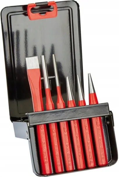 - Opis uzupełniający: Skład zestawu: 1 punktak (nr zamów. 6874) 120 x 10 mm 2 wybijaki do zawleczek (nr zamów. 6863) 4 i 6 x 150 mm 2 przebijaki (nr zamów. 6860) 2 i 3 x 120 mm 1 przecinak płaski 150 mm