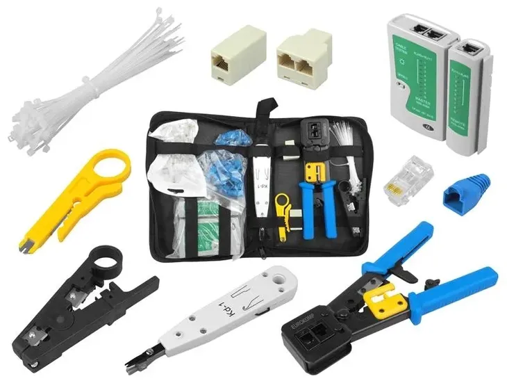 Zestaw sieciowy 10 elementów LAN + etui. Zestaw narzędzi do budowy sieci komputerowych również w technologii Pass Through (wtyków przelotowych):
