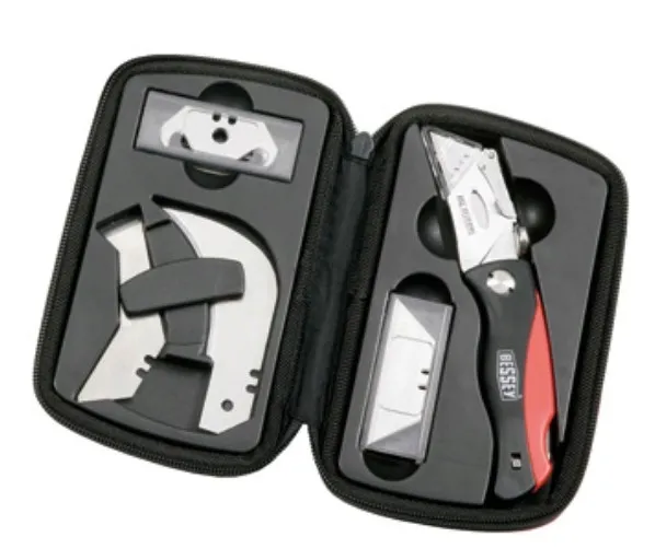 Dane techniczne:Numer katalogowy: DBKPH-SETOpakowanie: 8 sztWaga: 0,56Szczegóły produktu:Nóż z wygodną rękojeścią z tworzywa sztucznegoPraktyczne nylonowe etui z zamkiem błyskawicznymCztery wymienne ostrza do cięcia różnych materiałówW opakowaniu z zawieszkąW zestawie: Nóż składany z chowanym ostrzem w praktycznym nylonowym etui + 15 ostrzy trapezowych DBK-T + 5 ostrzy hakowych DBK-H + 2 ostrza do cięcia linoleum DBK-L + 2 ostrza do wycinania DBK-A**Zdjęcie poglądowe.