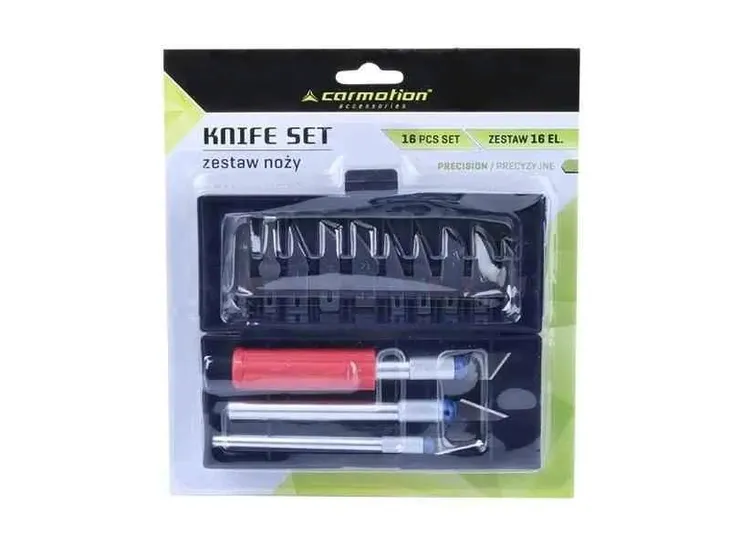 Zestaw zawiera noże, które idelanie sprawdzą się do cięcia drewna, kartonów, plastiku, folii, wosku i tkanin.