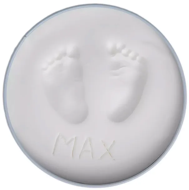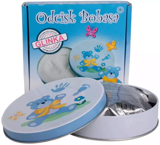 Zestaw składa się z ozdobnej puszki, w której umieszczona jest kolorowa masa glinkowa. Została ona tak przygotowana, aby było można w bardzo łatwy i szybki sposób przygotować ją do użycia, całkowicie samodzielnie. Wystarczy tylko wymieszać różową lub niebieską masę z zalecaną ilością wody, przełożyć do ozdobnej puszki, a następnie odczekać chwilę, aż zacznie tężeć. W tym momencie można już odcisnąć rączkę lub stopę Malucha oraz na spodzie wieczka wypełnić metryczkę, która zawiera miejsce na wpisanie imienia, wieku dziecka oraz datę zrobienia odcisku. Każdy z zestawów zawiera szczegółową instrukcję obsługi, dzięki czemu wykonanie masy do odcisku nie będzie stanowiło żadnego problemu. Wykonanie pamiątkowego odcisku rączki lub stopy Malucha z pewnością będzie doskonałą zabawą dla całej rodziny. Nasz „Odcisk Bobasa” to pomysł na świetną zabawę. Całość jest bardzo atrakcyjnie zapakowana w kolorowy kartonik, dzięki czemu nasz produkt idealnie się nadaje na prezent dla każdego Maluszka. Specyfikacja techniczna: • wymiary opakowania: 4.0 x 16.0 x 14.0 cm