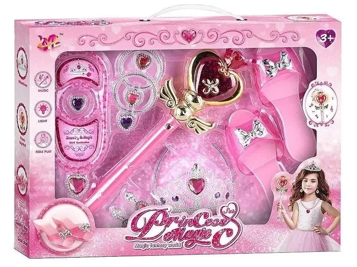 zestaw piękności, buty, różdżka, diadem, biżuteria; 44,6x33x6,4cm, W/B