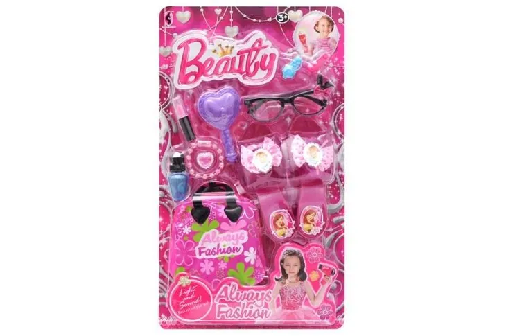 Zestaw piękności. W komplecie buciki, torebeczka, szczotka, pomadka, okulary, szczotka, pierścionek, bransoletka, spinki. Wymiary zabawki: 50x28x7 cm.