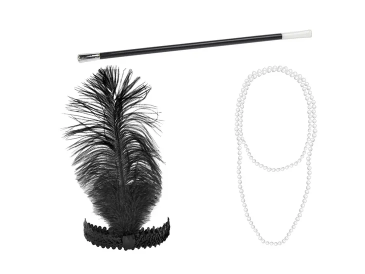 Zestaw Charleston to 3 dodatki idealne na imprezę w stylu lat 20, 30 czy nawet 40.Zestaw zawiera:- opaska z piórkiem,- cygaretka - 30 cm,- naszyjnik z pereł - 120 cm.