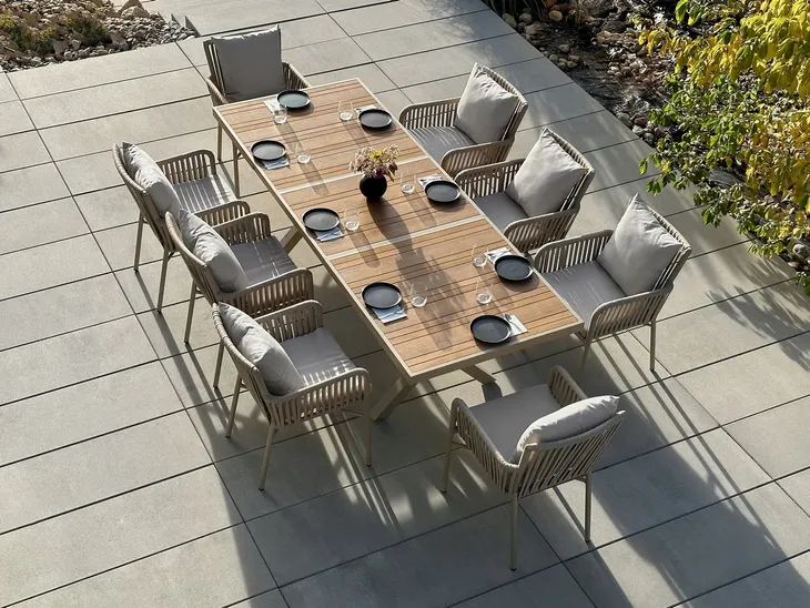 Zestaw ten składa się z8 wygodnych krzeseł wykończonych sznurem nylonowym dopasowanymi kolorystycznie poduszkami na siedziskach. Oraz stołu o wymiarze 90x180/240x78 idealny dla 8 osób. Stół wsparty jest na aluminiowej ramie pomalowanej metodą proszkową. Blat stołu obiadowego wykończony jest deskami kompozytowymi.