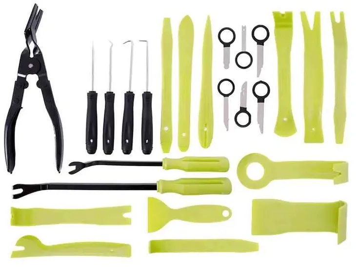 Specjalistyczny zestaw zawierający klucze i ściągacze do demontażu radia, kostek, listew, spinek i tapicerki.