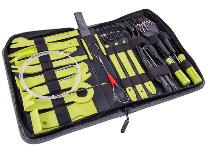 Specjalistyczny zestaw zawierający klucze i ściągacze do demontażu radia, kostek, listew, spinek i tapicerki.