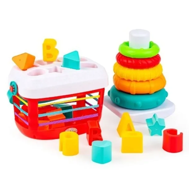 Zestaw, w którym kryje się cała masa kolorowych kształtów! Sorter w formie koszyczka pomieści aż szesnaście klocków w różnych kształtach, które są dołączone do zestawu. Po dopasowaniu elementów do otworów i umieszczeniu ich we wnętrzu koszyczka, wystarczy wyciągną je na zewnątrz, przez elastyczne, sznurkowe ścianki i już zabawę można rozpocząć od początku! Poza koszyczkiem, znajduje się tu też piramidka z pięcioma obręczami, różniącymi się nie tylko rozmiarem, ale też fakturą i kolorem. Zadaniem malucha jest odpowiednio ułożyć obręcze od największej do najmniejszej, aby stworzyć z nich kompletną piramidkę.