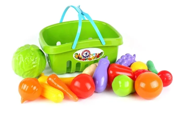 Zestaw zabawkowy w koszyczku- owoce i warzywa. W zestawie 17 jasnych elementów. Wszystkie są wysokiej jakości, bezpieczne, trwałe.