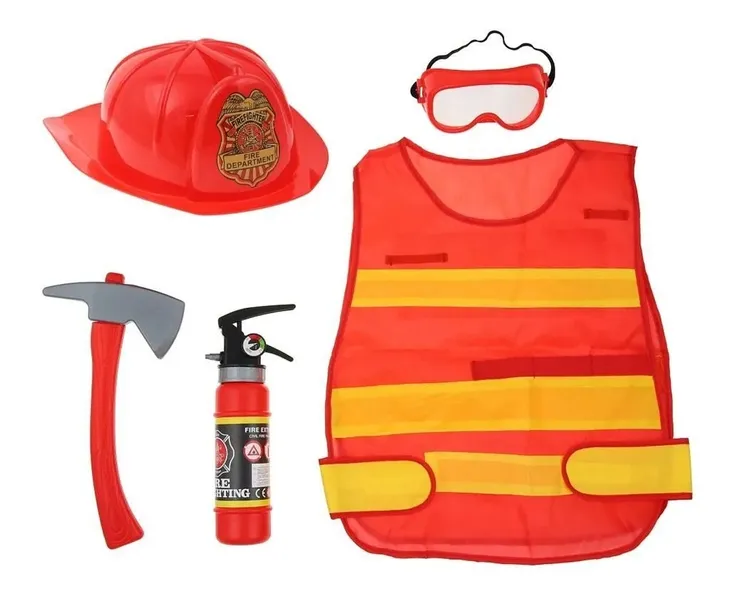 ZESTAW STRAŻAKA (5 ELEMENTÓW) W skład zestawu wchodzą: kamizelka strażacka, gaśnica, toporek, hełm oraz gogle ochronne Długość gaśnicy:23 cm Obwód hełmu: 53 cm Mocowanie gogli: na gumkę Kolor: czerwony, żółty Materiał: plastik, kamizelka - poliester