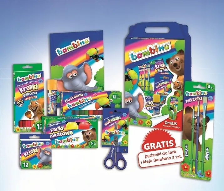 Rewelacyjny zestaw upominkowy Bambino został specjalnie stworzony dla małego artysty. Każde dziecko znajdzie w nim najpotrzebniejsze artykuły do wykonania różnorodnych prac plastycznych – począwszy od kredek, farb, plasteliny.