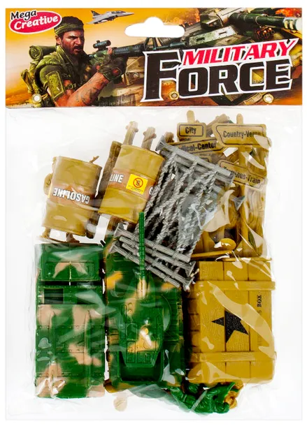 Zalety produktu: dostarczy każdemu dziecku sporą dawkę dobrej zabawy i rozbudzi jego kreatywność. Żołnierz to równie popularny zawód wśród grupy małych dzieci, co policjant. Zabawa Zestawem Wojskowym MEGA CREATIVE dostarczy każdemu dziecku sporą dawkę dobrej zabawy Zawartość zestawu: 2 czołgi, skrzynka z nabojami, beczki oraz figurki żołnierzyków. Wymiary/waga/baterie: wymiary produktu dł. x wys. x gł. cm : 18x28x5, wymiary opakowania dł. x wys. x gł. cm : 18x28x5, waga produktu bez opakowania kg : 0,39, waga produktu w opakowaniu kg :0,45. Nie wymaga zasilania bateriami. Produkt przeznaczony dla dzieci w wieku: 3 . Całość pakowana w woreczek z zawieszką.