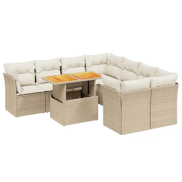 - Stolik: Kolor: beżowy, Materiał: rattan PE, stal malowana proszkowo, lite drewno akacjowe, Wymiary: 100 x 55 x 44/73 cm.