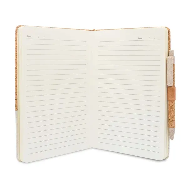 Elegancki notes łączący naturalny korek z płótnem. Rozmiar A5, 80 kartek w linie ( gramatura70 g/m2). Wyposażony w długopis wykonany z korka, słomy pszennej i PP. Pakowany w pudełko.