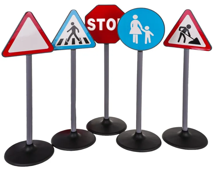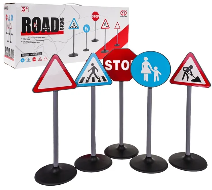 Zestaw znaków 5 znaków drogowych dla dzieci od 3-go roku życia. Komplet składa się ze znaków drogowych: znak stop, przejście dla pieszych, trójkąt ostrzegawczy, roboty drogowe, droga dla pieszych, które wykonane zostały z dbałością o szczegóły i bardzo realistycznie wyglądają. Rozmiarem oczywiście dopasowane do wzrostu dziecka. Idealna zabawka do nauki zasad ruchu drogowego.