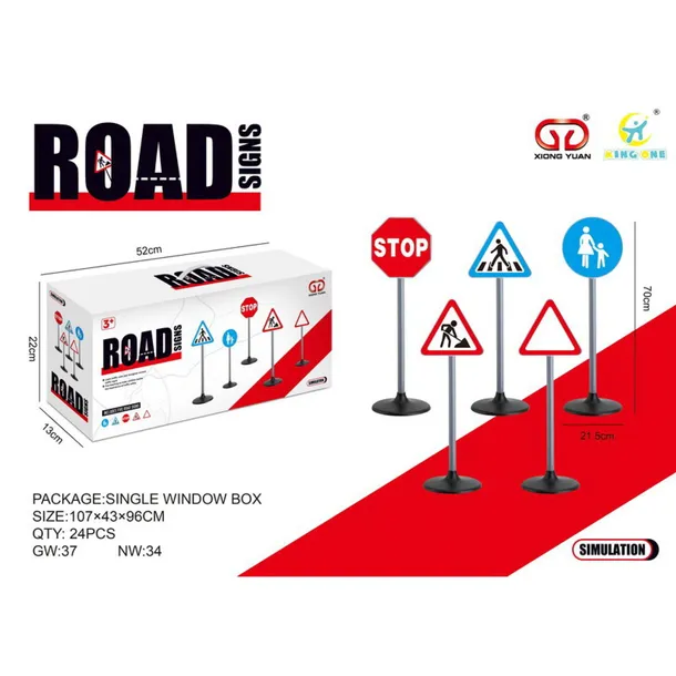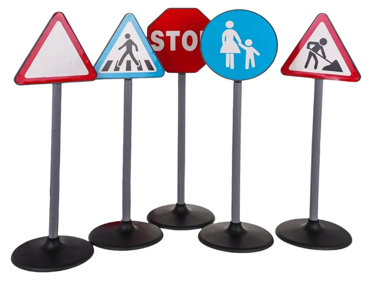 Zestaw znaków 5 znaków drogowych dla dzieci od 3-go roku życia. Komplet składa się ze znaków drogowych: znak stop, przejście dla pieszych, trójkąt ostrzegawczy, roboty drogowe, droga dla pieszych, które wykonane zostały z dbałością o szczegóły i bardzo realistycznie wyglądają. Rozmiarem oczywiście dopasowane do wzrostu dziecka. Idealna zabawka do nauki zasad ruchu drogowego.