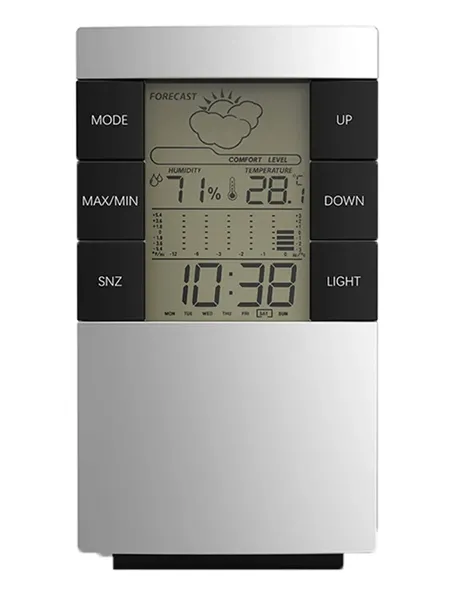 Elektroniczna stacja pogody, gadżet niezwykle przydatny w każdym domu. Kompaktowe wymiary i zasilanie bateryjne zapewniają wygodę użytkowania. Urządzenie wyświetla bieżącą temperaturę oraz wilgotność powietrza we wnętrzu pomieszczenia. Stacja posiada ponadto zegar z budzikiem, prosty kalendarz oraz prognozę pogody. Duży i czytelny wyświetlacz LCD z podświetleniem ułatwia sprawdzenie pomiarów.