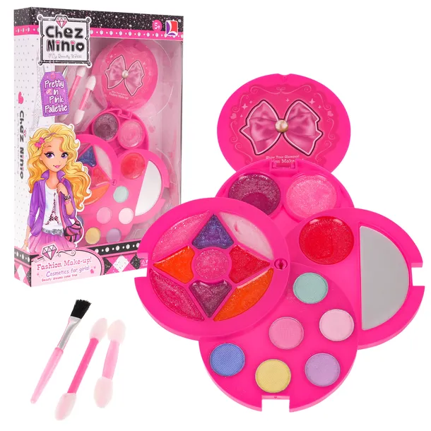 Bezpieczny zestaw do makijażu dla dzieci od 5-go roku życia. Zestaw składa się z otwieranej kosmetyczki, w której znajdują się cienie do powiek, błyszczyki, lusterko oraz patyczki i pędzelek do makijażu.