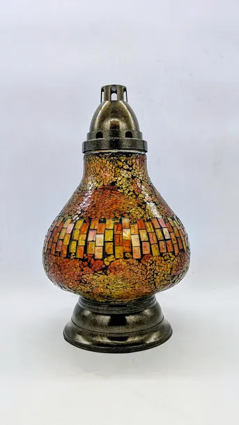 Elegancki znicz w ciepłej bursztynowo-pomarańczowej kolorystyce, wykonany ze szkła z dekoracją mozaikową nakładaną ręcznie. Korpus znicza zdobiony jest dwoma rodzajami mozaiki — górna i dolna część pokryta jest drobną, nieregularną mozaiką z kawałków szkła w odcieniach złota, pomarańczu i rdzy, natomiast środkowa część ozdobiona jest regularnie ułożonymi, prostokątnymi kafelkami szklanymi w odcieniach bursztynu i głębokiej pomarańczy. Czarne fugi pomiędzy kafelkami podkreślają intensywność barw i nadają całości orientalnego charakteru. Przy zapalonym zniczu całość pięknie migoce i przepuszcza ciepłe, złociste światło, przywołując na myśl blask jesiennego słońca.