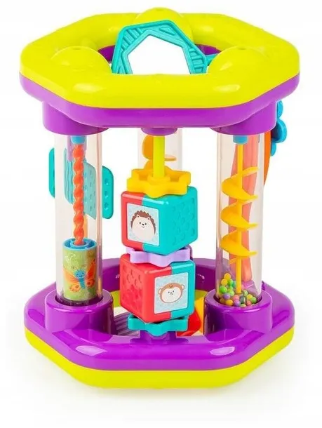 Jedna zabawka, w której kryje się cała masa atrakcji dla bobasa! Na każdej ze ścianek Rolusia znajduje się inna zabawa, aktywizująca małe rączki. Znajdziemy tu kwiatek do przesuwania, obrazki zwierzątek do obracania, grzechotki, bezpieczne lusterko, a nawet zjeżdżalnie z koralikami. Wszystkie te ruchome i grzechoczące elementy mają za zadanie jak najlepiej stymulować zmysły maluszka, zachęcając go przy tym do aktywnej, sensorycznej zabawy!Produkt przeznaczony jest dla dzieci od 6 miesiąca życia. Cechy produktu:- 8 ścianek, na których znajdują się różne niespodzianki;- obrotowe obrazki;- grzechoczące koraliki;- kształt dostosowany do małych rączek;- wiek: 6m+.