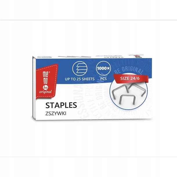 Zszywki MemoBe. Ocynkowane w rozmiarze 24/6. Wykonane z wysokiej jakości stali. Zaostrzone końce zapobiegają zginaniu i łatwo przebijają zszywany plik. Zszywa do 25 kartek standardowego papieru (70g/m2).